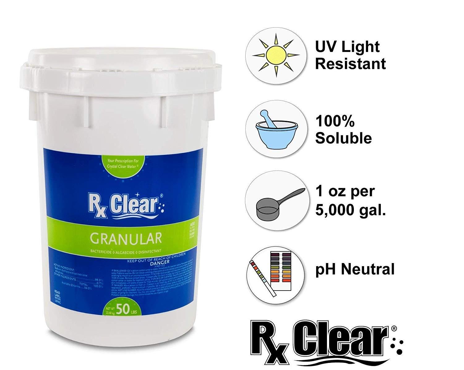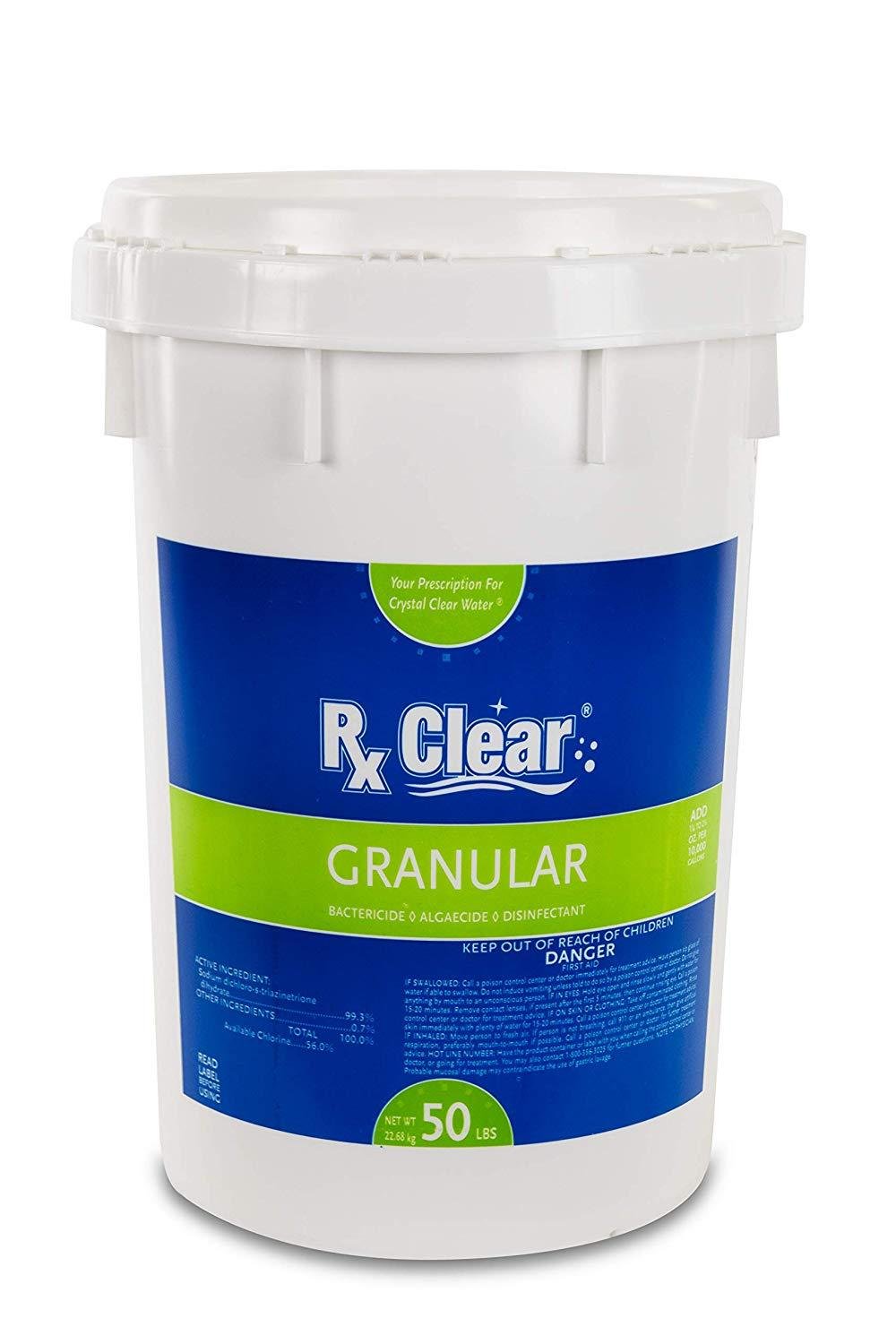 Rx Clear Granular Chlorine delivers effective, impressive, and economically beneficial results that you can rely on. Whether for a special shock treatment to deal with contamination problems or for regular, weekly usage, our chlorine granules will destroy bacteria and other organic contaminants so you can enjoy a clean, inviting swimming pool or spa.